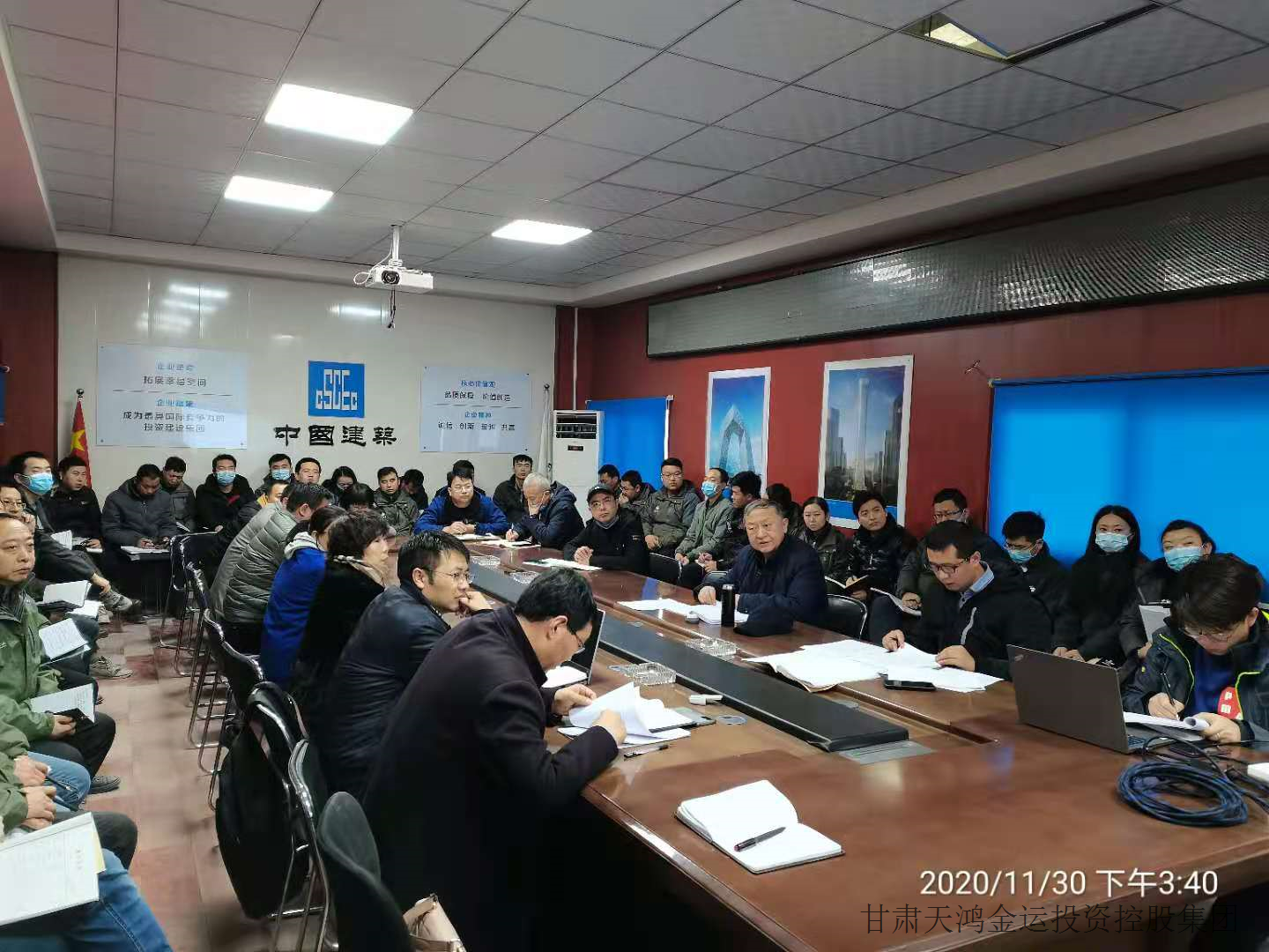 2020年11月30日下午,董事長(zhǎng)主持召開(kāi)了“鴻運(yùn)茂”項(xiàng)目關(guān)鍵時(shí)刻的一次生產(chǎn)會(huì)。董事長(zhǎng)指出:2020年只剩下一個(gè)月時(shí)間,但是離我們?nèi)甑哪繕?biāo)任務(wù)完成還有很大差距,他號(hào)召大家利用有限的時(shí)間,發(fā)揚(yáng)金運(yùn)人拼搏精神,全力以赴,加班加點(diǎn)完成機(jī)電安裝及一次性消防驗(yàn)收、裙樓機(jī)電安裝、園林首層結(jié)構(gòu)等緊要任務(wù)。